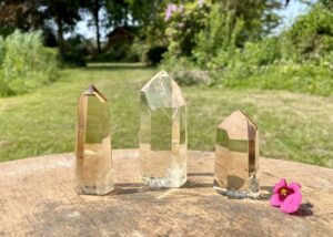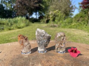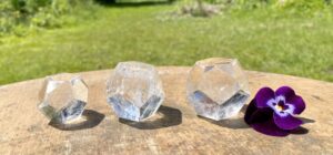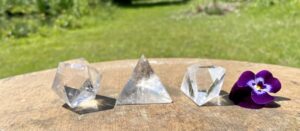 Toen ik net in de winkel liep zag ik dat ik in een van de vorige blogs was vergeten te schrijven dat we ook een aantal verschillende geslepen Bergkristallen hebben. We hebben een paar verschillende geometrische figuren of platonische lichamen. Deze zijn los te koop, we hebben er geen sets van, je kunt ze dus zelf uitzoeken. We hebben ook mooie kwarts die geslepen is in een traditionele diamantvorm die Briljant genoemd wordt. Deze zijn heel decoratief om ergens neer te leggen.