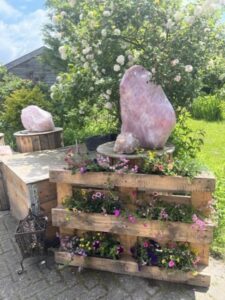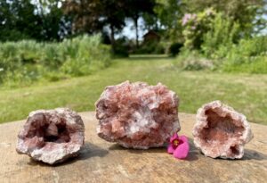 De laatste steen voor deze blog zijn de liefdevolle, kleine Roze Amethist geodes uit Argentinië. Sinds de Tucson show hadden wij deze niet meer bijgekocht, maar nu konden we er kopen die niet holle geodes zijn, maar dit zijn exemplaren die bijna helemaal gevuld zijn met dieproze Amethist, met soms een kern van wit kwarts. Deze exemplaren hebben veel meer massa/body dan de etherische, holle geodes. Ik heb ze gekocht bij een bevriende handelaar en heb een groot aantal zelf mogen openkraken. Zo mooi om dan de schoonheid te zien en de liefde te voelen als je voor het eerst zo’n kristal opent.