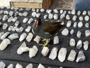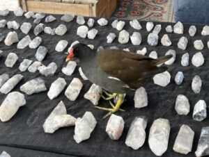 Het weer is zo heerlijke de laatste weekeinden en we merken dat veel klanten tussendoor heerlijk genieten van een kopje koffie of thee op ons terras. Laatst zat ik zelf heerlijk een boek te lezen toen ik gerommel achter mij hoorde. Toen ik ging kijken zag ik een van de twee waterhoentjes prinsheerlijk over de tafel met uitgestalde Sjamaan Lithium Protectorkwarts kristallen lopen. Blijkbaar vond ook hij deze energie heel erg prettig, want hij is een behoorlijke tijd op de tafel blijven zitten. Deze watervogels wonen inmiddels een aantal jaren bij ons en omdat we ze ook altijd wat voer geven zijn deze vrij schuwe vogels heel erg op hun gemak bij ons. Ze zijn af en toe zelfs zo brutaal dat ze het Pakhuis inlopen, omdat ze graag wat eten willen. Helaas laten ze dan altijd een vrij grote en natte boodschap achter, maar omdat we altijd weer voor ze smelten nemen we dit natuurlijke gedrag maar op de koop toe. Dit heet onvoorwaardelijke liefde haha.