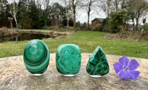 Krachtige reiniger van het emotionele lichaam die trauma’s uit een vorig leven of jeugd helpt op te heffen. Zeer belangrijke steen voor bescherming tegen negatieve energieën, straling en vervuilende stoffen uit de omgeving. Hij vult de aura met positieve vibraties en sterkt deze bij het uitfilteren van negatieve energie. Dit is een van de weinige groene mineralen die het element vuur bevat. De steen bevat de ‘mannelijk’ of Yang energie van koper die de steen groen kleurt. Deze energie helpt ons om actie en ideeën vorm te geven en om te creëren. Malachiet stimuleert de zonnevlecht en bevordert afstemming op dit chakra waardoor je wensen en dromen kunt creëren en manifesteren. De steen maakt zelfverzekerd en ondernemend, geeft vastberadenheid om moeilijkheden te overwinnen en de integriteit om trouw te blijven aan je eigen koers. Malachiet herinnert ons eraan dat we medescheppers zijn in deze wereld en dat de mogelijkheden voor onze creaties eindeloos zijn. Goede steen voor mensen die maar zitten te wachten tot hun werkelijkheid verandert omdat hij je aanzet tot het leven van je passie. Hij geeft je de kracht om welbewust je verantwoordelijkheid te nemen om je leven te leven zoals je graag wilt. Hij leert je om samen met de kosmos te scheppen en dat het noodlot een illusie is. Hij helpt je te aarden en stappen te nemen om je dromen in de fysieke werkelijkheid te verwezenlijken. Geneest aarde energieën en heeft een grote affiniteit met de natuur en met de devische rijken. Goed tegen machtsmisbruik op zowel geestelijk, energetisch en emotioneel niveau. Malachiet helpt emotionele verwarring op te heffen. De steen geeft kracht na ziekte en operatie en helpt bij de opbouw of heling van weefsel. Helpt ook bij het verwijderen van gifstoffen uit het lichaam en is dus ondersteunend tijdens het ontslakken of reinigen van het lichaam. Goed bij krampen en vergemakkelijkt een bevalling. Hij resoneert met de vrouwelijke geslachtsorganen. Goed bij astma, artritis, epilepsie, verlaagd de bloeddruk, tumoren, wagenziekte en duizeligheid, versterkt het immuunsysteem en goed bij diabetes. Goed voor de spijsvertering omdat het de maag en dikke darmfunctie stimuleert.