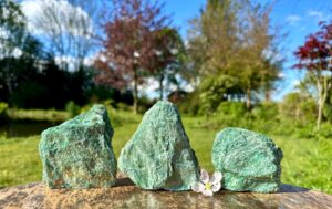 Een andere nieuwgevonden steen uit India raakte ons heel erg. Wat een prachtige zachte, liefdevolle, maar tevens hoge vibratie. Het bleek een Groene Heulandiet met Stilbiet te zijn. Nu komt groene Heulandiet al niet veel voor, dus daar werden we wel heel blij van, maar samen met Stilbiet is dit een fantastische combinatie die elkaar heel erg versterkt. We hebben palmstenen ervan en ook wat grote cabochon geslepen stenen. Dit is ook prachtig voor mensen die zelf sieraden maken.
