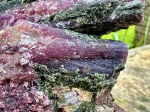Ook uit Brazilië hebben we weer wat van die mooie ruwe, staande stukken van een hele mooie groene kwaliteit Fuchsiet.
