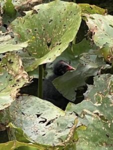 We vonden het zo zielig dat er steeds geen eitjes uitkwamen en eigenlijk toen wijzelf hadden opgegeven dat er nog jongen zouden komen, had mama toch nog een derde poging ondernomen. Op een morgen hoorde Wim tot grote verbazing een bekend piepend geluid uit de vijver komen en na een tijdlang speuren zag hij 1 kleine baby verstopt tussen de grote bladeren van de waterlelie. Het is dit jaar maar 1 jonkie geworden, maar wat zijn ze er blij mee en grappig genoeg ook wij allemaal. Dat het toch nog gelukt is. Zo leren deze mooie watervogels ons om nooit op te geven, dat ook al verwacht je het niet meer, iets toch nog kan gebeuren, dromen uit kunnen komen.