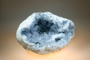 Celestien is een prachtig, liefdevol kristal met een hoge vibratie, die een vredig, veilig en geborgen gevoel geeft. Dit kristal is verbonden met Engelen en hogere wezens uit andere dimensies, die eigenlijk de hogere delen van onszelf zijn. Ze helpen ons om met deze delen in contact te komen en laten ons voelen dat we met hen verbonden zijn en dus niet alleen zijn, dat we onderdeel van deze groep zijn. We zijn nu wel met een klein deeltje in de stof op aarde, maar we zijn zoveel meer. Hoe meer we met deze delen in contact komen en verenigen in onszelf, hoe gelukkiger en completer we ons gaan voelen. Dan kunnen we dit complete veld op aarde gaan neerzetten. Dit mooie kristal resoneert met een energieveld wat heel herkenbaar voor ons mensen is, waardoor bijna iedereen van deze houdt. Celestien geeft troost en is ook hier op aarde om de nieuwetijdskinderen van het licht bij te staan in hun leven op aarde. Deze kinderen die veelal heel hoog ontwikkeld zijn, de Meesters uit andere dimensies zijn. Deze kristallen hebben ook een hoger zelf, bevinden zich ook in andere, hogere dimensies. Celestien kristallen verschijnen op aarde in verschillende frequenties. Sommige bevatten krachtige spiegels, die draaien nergens meer om heen, laten transparantie zien. Deze laten zien dat niets meer verborgen kan blijven, dat alles zichtbaar wordt of aan het licht zal komen. Deze kristallen zijn krachtig met de keel verbonden en met het uitspreken. Het is een kristal van helderheid, verheldering, ophelderen, is ‘Crystal Clear’. Mensen die deze kiezen verlangen naar verlichting, naar transparantie, van alles en iedereen om zich heen, maar dat betekent dat je zelf ook compleet transparant dient te worden. Andere kristallen zullen meer een zachter, oordeel loos, troostend veld bevatten. Celestien wordt ook wel de steen van “het weten” genoemd. Helder weten is een hoge vorm van weten, wat ontstaat door puur vertrouwen in het hoger- of onderbewustzijn. Celestien kristallen groeien als ronde geodes en hebben net als wij ons bekken hebben een soort kom vorm. Deze zachte kristallen zeggen: Stop met naarstig zoeken, ga naar binnen, zak diep in jezelf, ga naar je bekken, de kom onder in je lichaam, in je ‘zijn’, in je veiligheid. Celestien helpt ons buikgebied te cleanen, leeg te maken, helpt bij het opruimen van al onze angsten en pijnen. Hoe meer we in vertrouwen zijn, we ons volledig in onze bedding durven laten zakken, dus volledig aanwezig kunnen zijn, hoe sneller we ontwikkelen. Voor dit proces is vertrouwen nodig, het gevoel dat we veilig zijn en dat het goed is. Daarna kunnen we vanuit helderheid gaan spreken. Alle Celestien kristallen met verschillende vibraties zijn energetisch met elkaar verbonden. Celestien bevat een zachte kracht, een zachte stevigheid. In een ruimte zijn deze kristallen een krachtige reiniger en opruimer van negatieve energieën, deze worden door het kristal geneutraliseerd, omgezet in een positieve, liefdevolle energie. Als een frisse kristal douche reinigt deze de ruimte. Deze kristallen die zuiverheid van het hart bevorderen helpen je aura, geest en lichaam te reinigen en een voorspoedig en gelukkig leven te leiden op weg naar verlichting. In fel zonlicht kan de steen van kleur vervagen.
