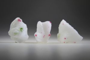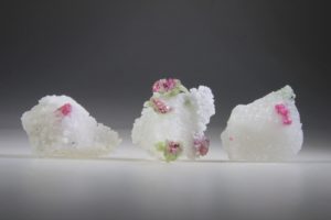Als laatste in deze blog nog een uniek en nieuwgevonden kristalletje. Spinel en Pargasiet zijn los van elkaar al veel langer bekend, maar deze in combinatie met elkaar, was tot voor kort nog niet gevonden hoorden wij van onze bevriende handelaren. De stenen lijken wel gesuikerde snoepjes met het roze/rood en groen op de witte ondergrond, welke marmer is, al zou je dat niet zo snel zeggen.