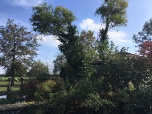 Wat boffen we toch nog met het prachtige weer. Deze week hebben we tussendoor al een gedeelte van de grote wilg op het eiland kort gesnoeid. We zagen erg tegen deze klus op omdat de boom inmiddels zo hoog geworden was. Maar omdat twee grote takken boven het prieel waren gegroeid en met een beetje wind er steeds tegen aan bewoog wisten we dat we deze nu echt moesten afzagen. Ook omdat we weten dat wilgen bij harde wind opeens kunnen scheuren en afbreken. Dit hebben we vorig jaar ondervonden toen een deel van de wilg aan de voorkant bij het hek na een storm afbrak, op het ijzeren hek viel en een aantal dakpannen van het huis deed breken. En om dit te voorkomen wisten we dat de wilg op het eilandje bij het prieel nu echt kleiner gemaakt moest worden. Gelukkig zijn wilgen zulke sterke bomen dat ze weer doorleven en net als een knotwilg weer nieuwe takken in het voorjaar maken. Het weer was nu nog zo goed dat we een deel van de klus hebben kunnen klaren. We hebben gelijk weer hout voor de houtkachel die in de winter de winkel verwarmt.