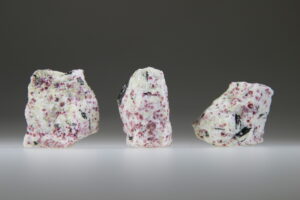 Onze vriend kent zoveel mensen over de hele wereld en unieke kristallen komen ook echt op zijn pad. Deze keer was het een man die lang geleden in de jaren 70 in Groenland was geweest. Deze man heeft hem ruwe Tugtupiet en Kakortokiet verkocht. Eenmaal hebben wij wat kleine stukjes Kakortokiet gehad, maar dit is jaren geleden en jammer genoeg hebben wij deze unieke steen nooit meer gezien. We konden deze kans niet voorbij laten gaan en hebben deze beide stenen ruw ingekocht. De Tugtupiet was een heel groot stuk die we met een speciale splijt machine bij onze vriend in kleine stukken hebben gehakt, deze machine zorgt ervoor dat je bijna geen verlies hebt en de steen heel netjes breekt, dus niet verpulvert. Het breken van een grote steen is altijd heel spannend want je weet niet hoeveel Tugtupiet er dan in het midden van een grote steen zit, maar wat een geluk hadden wij. Zelfs onze vriend was stom verbaast dat het stuk dat wij hadden gekozen helemaal vol met het roze Tugtupiet zat. Als je met een UV-lamp op de stukjes schijnt zie je hoe de stenen fel oplichten. Wat is dit toch een bijzondere, liefdevolle steen en zo uniek, omdat hij zonlicht absorbeert en daardoor roze kleurt. We hebben nu dus ruwe en getrommelde stenen in de winkel en ook op de webshop.