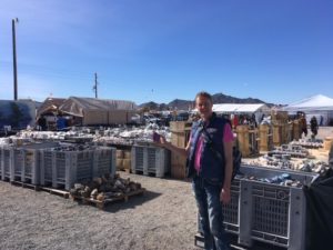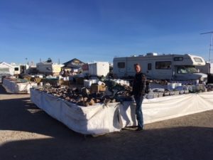 We zijn zo blij dat we niet een dag later zijn vertrokken, omdat we morgen een afspraak in Amerika hebben in Quartzsite, een plek in de woestijn waar ook mineralen worden verkocht. Naar deze plek gaan veel mensen altijd even voordat ze naar Tucson gaan. Het is heel anders dan Tucson, de meeste handelaren die daar staan zijn met een camper gekomen, het zijn vaak Amerikanen die zelf mijnen en hun spullen vanuit hun camper verkopen. Het is een heel groot terrein vol stof waar vaak een wind waait, de sfeer is die zoals je in de Mad Max films ziet. Er zijn ook veel stalletjes met spirituele spullen, maar ook heel veel rommel en heel veel junkfood. Echt een hele aparte sfeer. Wij zijn hier altijd om 7 uur in de morgen en lopen dan het hele terrein af en vertrekken dan aan het eind van de middag weer naar Phoenix. Om 10.00 uur hebben we een afspraak met Raymone, de man van de Mount Shasta mijn. We ontmoeten hem op het parkeerterrein van de Mc Donalds, kan niet missen ha ha. Die paal met de M steekt overal bovenuit.