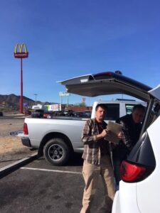 Toen we het terrein van Mc Donalds opreden zagen we zijn pick-up truck al staan. Ook hij was iets vroeger gekomen. Het werd weer een gezellig ontmoeting met een stevige ‘hug’. Het gesprek tussen ons, over hoe het met iedereen in de familie gaat ging het ook nog even over de nieuwe President van Amerika. Na wat lachen en grapjes vroeg Raymone ons heel serieus met schaamte of wij in Europa toch hopelijk niet denken dat alle Amerikanen zo zijn als President Trump en of ze toch niet denken dat ze allemaal zijn denkbeelden hebben. Hij meende het echt serieus, vond het zo beschamend. Wij konden hem vertellen dat dit echt het geval niet is, best sneu.
