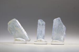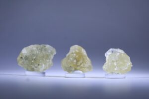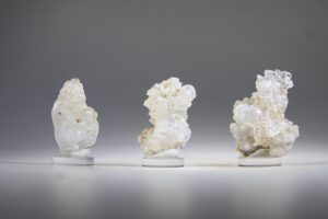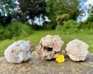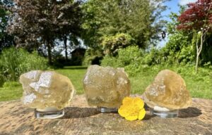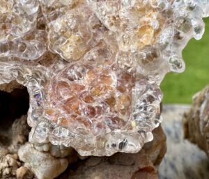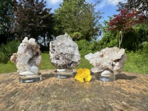 Een andere steen uit Mexico, de mooiste Hyaliet Opaal die wij ooit gezien hebben en volgens de mijneigenaar, de mooiste van de wereld zijn, zijn de witte geodes met de glasheldere Hyaliet Opaal erop, die als versteende waterdruppels lijken. Deze zijn gevonden in Mina Etienne, San Luis Potosí, Mexico. Wat heel bijzonder en vrij zeldzaam is, is dat deze Opaal onder een bepaalde frequentie van UV licht een felgroene kleur geeft. Dit blijkt een vrij zeldzame kleur. Dit was niet waarom ze ons riepen, voor verzamelaars is de kleuring soms heel belangrijk, maar voor ons was de schoonheid en prachtige, liefdevolle energie van deze stenen adembenemend. Sommige zijn in de vorm van een bloem. Het glanzende transparante Opaal veelal aan de randen ontroert.