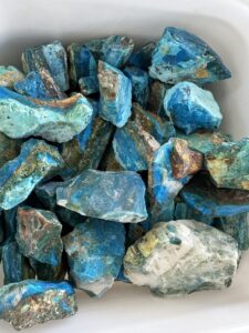 Een andere Opaal waar we weer een emmer van hebben ingekocht. Dit klinkt vreemd, maar de stenen uitzoeken is zoveel kostbaarder dan als we een emmer nemen. Deze prachtige, diepblauwe Andes Opaal hebben we jaren geleden ook al een keer in Amerika gekocht. De mijneigenaren die een mijn in Chili hebben stonden toen voor de eerste keer op de beurs. De meest bekende blauwe Andes Opaal komt uit Peru. Inmiddels wordt deze nog mondjesmaat gevonden en de enige die nog betaalbaar zijn bevatten amper meer een blauwe kleur. Die wel nog een mooie blauwe kleur hebben zijn kostbaarder dan sommige juwelen. De exorbitante gramprijzen zijn voor ons en onze klanten niet meer interessant.