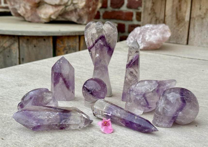 Van deze prachtige Amethist met fantomen hebben we ook andere items ingekocht. We hebben een klein aantal carvings van diertjes, deze staan bij de balie. Ook hebben we er obelisken en voor de liefhebbers schedels van. En voor de klanten die met deze fantastische hoogenergetische steen werken hebben we Vogel of Phi kristallen en ook nog geslepen dubbeleinders. Wat een keus.