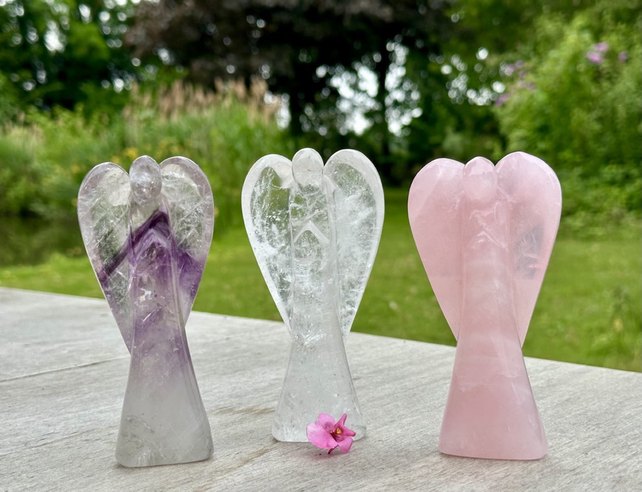 We zijn druk aan het uitpakken en nog lang niet klaar met alles sorteren en prijzen, maar de volgende beauty’s liggen nu al in de winkel. We konden niet wachten om al iets te kunnen tonen. Als eerste willen we heel graag laten weten dat we Engelen hebben laten maken van de gouden driehoek; Bergkristal, Rozenkwarts en prachtige Amethist met fantomen. Nu we toch de steensoort konden kiezen, vonden we deze met fantomen toch nog mooier dan de effen Amethist. Toen we ze uitpakten werden we zo blij. Ze zijn zo mooi gemaakt, met de fantomen zo symmetrisch. Deze zijn zo’n 13 tot 15 cm groot. Echt kippenvel van de energie. De Rozenkwarts en Bergkristal Engelen zijn zo’n 13 tot 20 cm groot. We hebben ook een aantal zeer grote exemplaren van Rozenkwarts laten maken, deze zijn zo rond de 25 cm. Er zit zelfs een exemplaar van 27 cm bij. Tussen de Rozenkwarts Engelen vonden we ook Maria Magdalena Opaalkwartsen. We kunnen ons geluk niet op. We weten zeker dat heel veel van onze klanten net als wij, heel blij van deze Engelen worden.