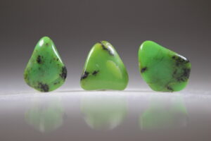 We zagen ook een hele mooie Appelgroene Serpentijn bij de verschillende Serpentijnsoorten liggen. We hadden net een grote zak Luipaard Serpentijn gekocht. Deze aparte steen met de mooie patronen die aan een katachtige doet denken hebben we al jaren in onze collectie. Maar nu riep een andere ons erg hard. Serpentijn is soms heel licht van kleur en wordt dan Infinity stone genoemd en de ‘normale’ is donkergroen, soms met strepen of vlekjes, maar een appelgroene hadden wij nog nooit gezien. Nu hebben we deze dus ook.