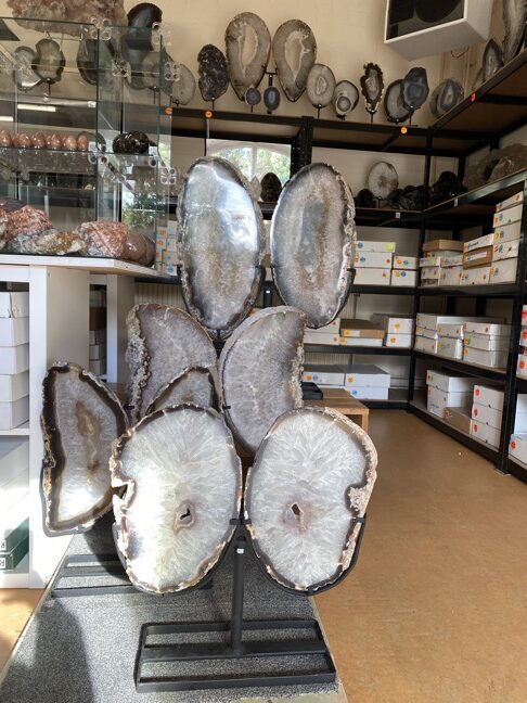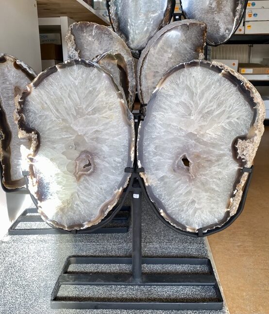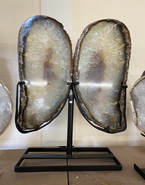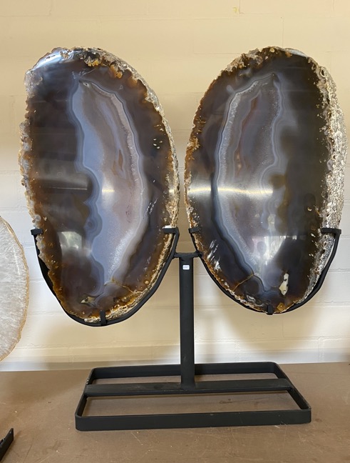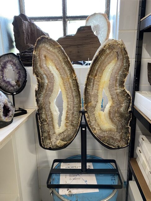 In deze blog willen we een aantal kristallen nog noemen die in de laatste blogs niet aan bod zijn gekomen, maar die al een paar maanden aanwezig zijn. Maar we beginnen met een net binnengekomen pallet vol prachtige Agaat vlinders of Twins zoals sommige klanten deze noemen. Wow wat waren we blij verrast toen we deze openden. We hadden bij een lieve vriend van ons die een aantal containers per jaar uit Brazilië importeert een paar weken geleden voor een mooie prijs twee pallets mogen overnemen, omdat hij ruimtegebrek had en deze ons gunde. Een pallet met kleine schijven op standaard en een pallet met de grote Agaat schijven, zie de vorige blog. De kleine schijven hebben we al vaker gehad, maar de grote nog nooit, ook hij wist niet meer hoe deze eruit zagen, dus het was een beetje een gok. Nu dit bleek een hele goede gok, want we waren zo blij met deze prachtige stukken toen we ze uitpakten. Ik heb hem toen gelijk een berichtje gestuurd en gevraagd of hij nog een pallet voor ons had. Deze is vorige week aangekomen en Wim kon afgelopen zaterdag niet wachten om deze uit te pakken. Wat een verrassing was deze pallet. Deze bleek gevuld te zijn met prachtige Agaat vlinders of Twins of Engelen. Twee Agaatplakken van dezelfde Agaatknol naast elkaar in een zwarte ijzeren standaard, zodat je de vorm van vleugels krijgt. Dit hadden we totaal niet verwacht. Wat een prachtig cadeau weer. Deze zijn aan twee kanten gepolijst en staan op een standaard die ook aan twee kanten hetzelfde is, zodat ze aan beide kanten mooi zijn.