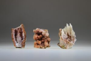 Deze prachtige, kleine, ruwe mineralen zijn allemaal anders, de kleuren variëren in wit, roze en rood, veelal gecombineerd. Je ziet de kristalletjes soms uitgegroeid tot mini stalagmieten. Deze Rozerode Chalcedoon is verbonden met de energie van wind en zand, met de constante bewegingen, verschuivingen van het leven. Ze zijn onder moeilijke omstandigheden gevormd en dragen een schoonheid in zich die uniek is. Dit alles staat symbool voor de weg van de groei van de ziel van ons mensen. De steen laat weten dat je onder moeilijke omstandigheden gebukt kan gaan, maar dat je deze ook kunt zien als dat deze ons vormt en mooier maakt, ons polijst. Deze mooie Chalcedoontjes helpen ons om rustig te blijven in de stormen, de hectiek van het leven. Onder moeilijke omstandigheden het hoofd koel houden, niet in de angst schieten of in paniek raken. Dat je onder zware omstandigheden bij jezelf kunt blijven. Ze stralen een rust en kalmte uit, als Bedoeïenen in een woestijnstorm, die rustig bij zichzelf zijn, die weten wat te doen, of juist niet te doen. Die op hun innerlijke weten vertrouwen en samen met de natuur leven en zich onder grillige omstandigheden weten staande te houden. Rozerode Chalcedoon resoneren krachtig met de luchtwegen en de longen en helpen ons om dieper en bewust adem te halen. Ademhalen is de belangrijkste manier om energie tot ons te nemen en weer los te laten via de uitademing. Bewust ademhalen kan helpen om stress te verlichten en emotionele trauma’s los te laten, waardoor er weer ruimte komt en je lichaam kan gaan ontspannen en je levensenergie weer kan gaan stromen. Als we bewust ademhalen kunnen we Prana of levensenergie tot ons nemen, kosmische energie. We voeden dan onze cellen op een hoog niveau.