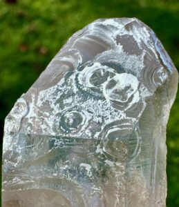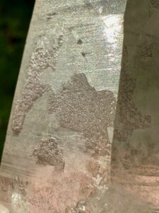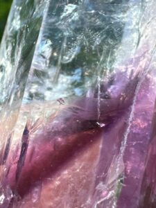 Het volgende kristal welke ook uit dezelfde streek komt noemen ze in Brazilië Amethist/Prasioliet met inclusies. Een heerlijk kristal wat sterk verbonden is met verschillende lagen van Moeder Aarde, met de natuur en alle natuurwezens, maar ook met de Binnen-Aarde. Dit zijn ideale kristallen voor Sjamanen of zij die zich krachtig verbonden voelen met onze Aarde. Ook heel mooi om grids mee te maken en voor in een helingspraktijk.