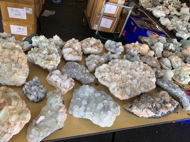 Wij zeiden tegen de Apofylliet man dat we konden helpen met uitpakken en dat we dan wel zouden uitzoeken en gelijk zijn kraam inrichten. Hier was hij heel blij mee. We zijn 3,5 uur aan een stuk door hard aan het werk gegaan, we hebben 2,5 pallet vol dozen met stenen, die heel goed in kranten waren ingepakt, uitgepakt en alle voor ons mooie exemplaren op andere tafels gelegd. Een werknemer reed af en aan met een wagentje met dozen voor ons. Het was wel warm onder het tentzeil met 31 graden in de buitenlucht, dus we moesten wel opletten dat we bleven drinken, maar het uitpakken van stenen gaf ons zoveel plezier en energie dat wij maar door bleven gaan. De twee mannen keken ons af en toe aan of we helemaal gek geworden waren om zo hard te werken in deze temperaturen. Maar voor ons is het een normaal tempo. Toen hun hele kraam ingericht was en wij precies 3 grote volle tafels voor onszelf hadden waren we allemaal blij. De mannen omdat ze anders nog een halve dag minimaal nodig hadden om hun kraam in te richten en wij, omdat we prachtige stenen hadden. Heerlijk! We zagen er alleen niet uit, zwarte handen en kleren maar zo voldaan. Maar daar schaam je je niet meer voor, want heel veel mensen op deze beurzen zien er niet al te schoon uit in de hitte, de stof en door het werken. Je nagels breken altijd af, nagelriempjes zijn gescheurd ondanks af en toe een likje handcrème en maar niet te spreken over rouwrandjes onder de nagels. Normaal zouden wij niet zo rondlopen, maar zelfs na 3 wasbeurten in een toilet krijg je ze nog niet schoon. Maar dat hoort er allemaal bij haha.