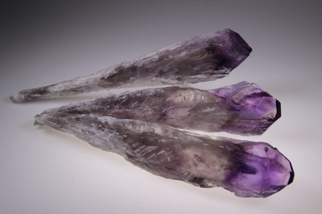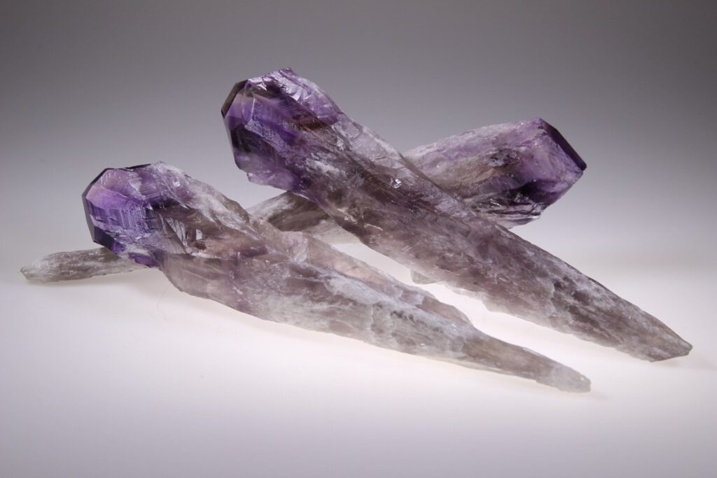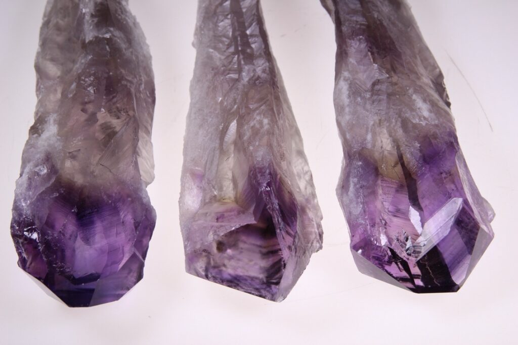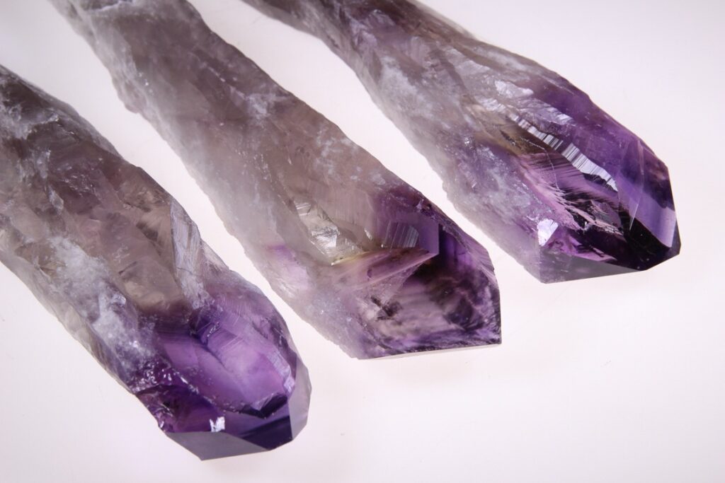 Deze unieke, lange punten met een fantoom in de punt werken als een toverstaf, ze sturen de krachtige energie van de steen door de punt naar buiten. Maar ook in zijn geheel straalt de steen een fantastische energie uit. Als je ze zachtjes tegen elkaar tikt, klinken ze als prachtige Lemurische lasers, dus ook zeer geschikt voor klankheling. Dit zijn krachtige helings instrumenten. Amethist is een krachtige zuiverende en beschermende spirituele steen met een hoge vibratie die verbonden is met het derde oog, de kruinchakra, de hogere etherische chakra’s en de violette straal van transformatie. Hij verbindt je met je eigen goddelijke oorsprong, stimuleert het denken, de heldere vermogens en de intuïtie. Hij helpt je om diepere inzichten en de oorzaken van levenservaringen te krijgen. Amethist stimuleert je om verantwoordelijkheid te nemen voor je realiteit door je te herinneren aan je relatie met de kosmos, het hogere wezen dat je bent en waarmee je alles creëert. Amethist maakt je ontspannen, wat nodig is voor het afstemmen op je hogere zelf, hierdoor ook heel geschikt voor meditatie. Hij kalmeert je gedachten en geeft innerlijke en mentale rust. Hij werkt beschermend bij psychische aanvallen en zet deze om in liefde. Hij zuivert tevens de aura, werkt kalmerend en blokkeert negatieve energieën en geopatische belasting, doordat hij je helpt met het opbouwen van een energieschild, een veld van spiritueel licht rond het lichaam. Amethist helpt je bij het nemen van besluiten, bevordert het gezond verstand en spirituele inzichten, verdrijft woede, angst en bezorgdheid en verlicht leed en droefheid. Spoel hem bij intens gebruik af en toe af onder stromend water.  De steen bevordert hogere bewustzijnstoestanden en helpt bij slapeloosheid. Hij is weldadig voor pijnen, hoofdpijn, nachtmerries, woede, angst, verdriet, longen en huidproblemen. Het fantoom in de punt van het kristal zorgt ervoor dat je verder kunt groeien. Fantomen vertegenwoordigen blokkades die opgeruimd dienen te worden. Het symboliseert ook de talloze levens van de ziel. Het maakt bezoeken aan de toestand tussen twee levens mogelijk om je huidige zielsplan te ontdekken en helpt je naar vele dimensies te reizen, of naar je kern. Fantoomkwarts maakt je bewust van je eigen goddelijkheid. Het verzoent je met je schaduwkanten en helpt het fysieke lichaam via de etherische blauwdruk te genezen. Naar onder toe zijn de punten Rookkwarts. Rookkwarts is een van de krachtigste stenen voor aarding en zuivering die er bestaan. De steen zuivert de aura en de energetische systemen, net zoals een bosje salie dat doet. Heel goed om zweverige mensen op aarde te krijgen, zodat ze volledig als lichamelijk wezen kunnen functioneren. Deze beschermende steen heeft een sterke band met de aarde. Wanneer je in de hogere werelden werkt helpt rookkwarts je weer in je lichaam te komen. Tevens helpt het spirituele informatie te aarden. Het absorbeert geopatische en elektromagnetische smog, helpt bij uitscheiding en ontgifting op alle niveaus en vult de ruimte met een positieve vibratie. Goed bij stress, angsten, burn-out, depressie en geeft emotionele rust. Zorgt voor acceptatie van het fysieke lichaam. Helpt bij faalangst en reinigt de geest voor meditatie. Rookkwarts biedt bescherming tegen negatieve energieën en kan deze vrijwel onbeperkt opnemen en omvormen. Zeer weldadig bij kwalen van de buik, heupen en benen. Verlicht pijn, ook hoofdpijn. Heft krampen op. Rookkwarts kan ook tegen negatieve gevolgen van straling worden ingezet, bijvoorbeeld wanneer je aan radioactief materiaal bent blootgesteld, radiotherapie hebt ondergaan, of met elektromagnetische velden te maken hebt gehad. Dit bijzondere kristal verhoogt aanzienlijk de overbrenging van licht en informatie tussen de hogere regionen en de aarde en kan worden gebruikt voor etherische chirurgie.