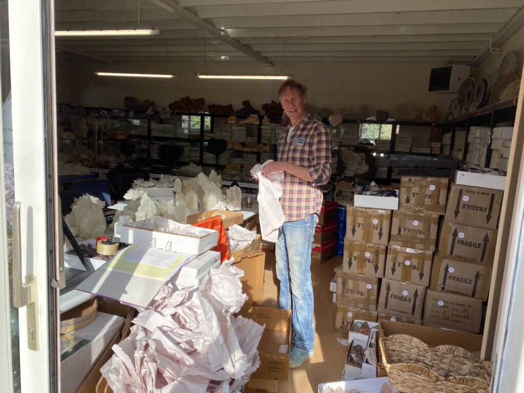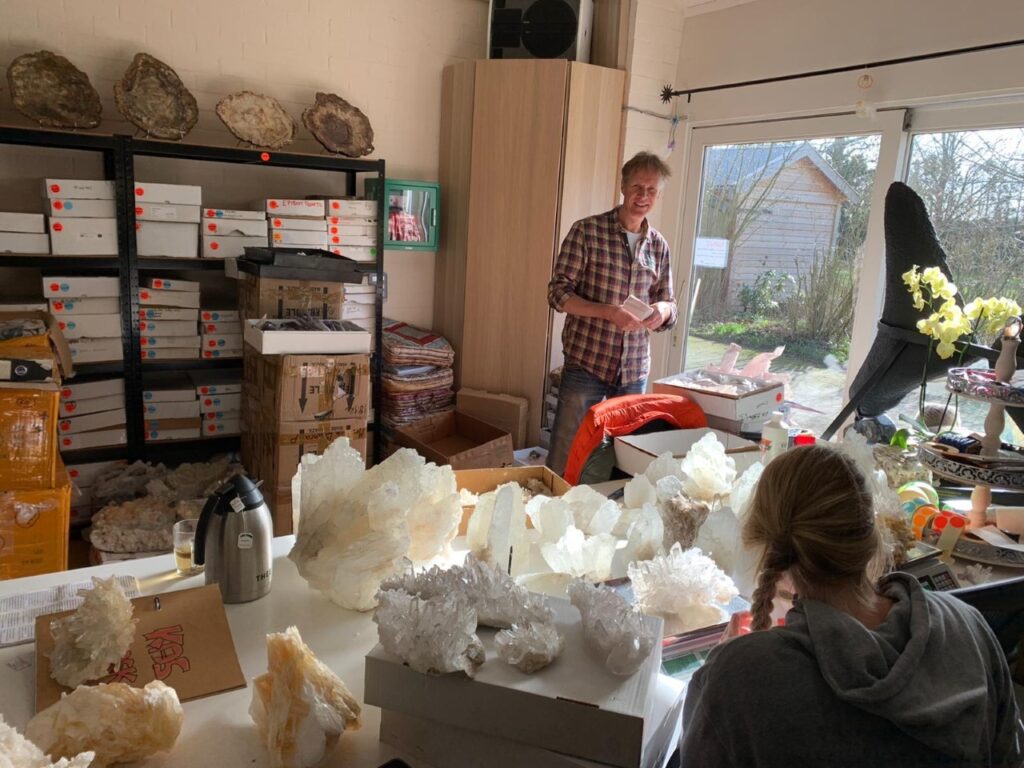 Op het moment dat ik deze blog schrijf is het hier nog een gekkenhuis. Dit begon nadat de nieuwe pallets waren binnengekomen. Alleen al deze allemaal leeghalen, sorteren en een plekje zien te vinden voor stenen die we niet gelijk nodig hebben was al een hele klus. Daarna alle rekeningen erbij en de prijzen bepalen. Op dit moment zijn we allemaal druk aan het prijzen. Dit is nooit een straf, want het is heerlijk om alle schatten weer te zien en ook onderling is het altijd gezellig met een muziekje aan. Wim en Nikki zijn druk met het leeghalen en schoonmaken van de winkel en wij van de ‘prijsploeg’ brengen steeds dozen met de nieuwe stenen die dan een mooi plekje in de winkel krijgen. Tussendoor bewonderen we hoe mooi de winkel aan het worden is. De energie is nu al skyhigh, wat moet dat wel niet worden. Maar uit ervaring weten we dat als de winkel helemaal is ingericht dat de kristallen na een of twee dagen heel harmonisch met elkaar gaan resoneren. Natuurlijk is de winkel een krachtige helings-, transformatie plaats waar emoties los kunnen komen. Maar dit is ook de bedoeling van deze plek, dus alleen maar heel fijn. Tussendoor heeft Wim ook nog foto’s van de nieuwe kristallen gemaakt die Cyrille allemaal in de computer invoert, waarna ze op de site geplaatst worden. Als de eerste openingsdagen achter de rug zijn zullen we gaan kijken welke stenen geschikt zijn om op de webshop te zetten. Ik ben net terug van een snel tripje tussendoor om zilveren sieraden in te kopen. In een latere blog zullen we deze weer in het zonnetje zetten. Wat ik wel heel graag al wil melden is dat we nu ook ringen verkopen. Al jaren wordt hierom gevraagd, maar we wisten niet waar we alles moesten laten. We hebben nu een mooi plekje aan de muur bij de sieraden gecreëerd, dus we zullen hier best veel mensen blij mee maken.