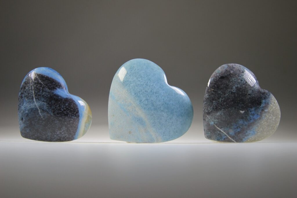 Ik zag ook nog wat trommelstenen in meer hoekige vormen liggen van blauwe Paraiba kwarts uit Brazilië. De naam is gegeven doordat de blauwe kleur lijkt op Paraiba Toermalijn. Eigenlijk komt de lichtere blauwe kleur door Troilite en de donkere door Lazuliet. Wij hebben er geslepen punten, vlammen en hartjes van in de winkel. Op de webshop staan nog een aantal punten. Dus heel blij dat we nu ook wat kleine steentjes ervan hebben.