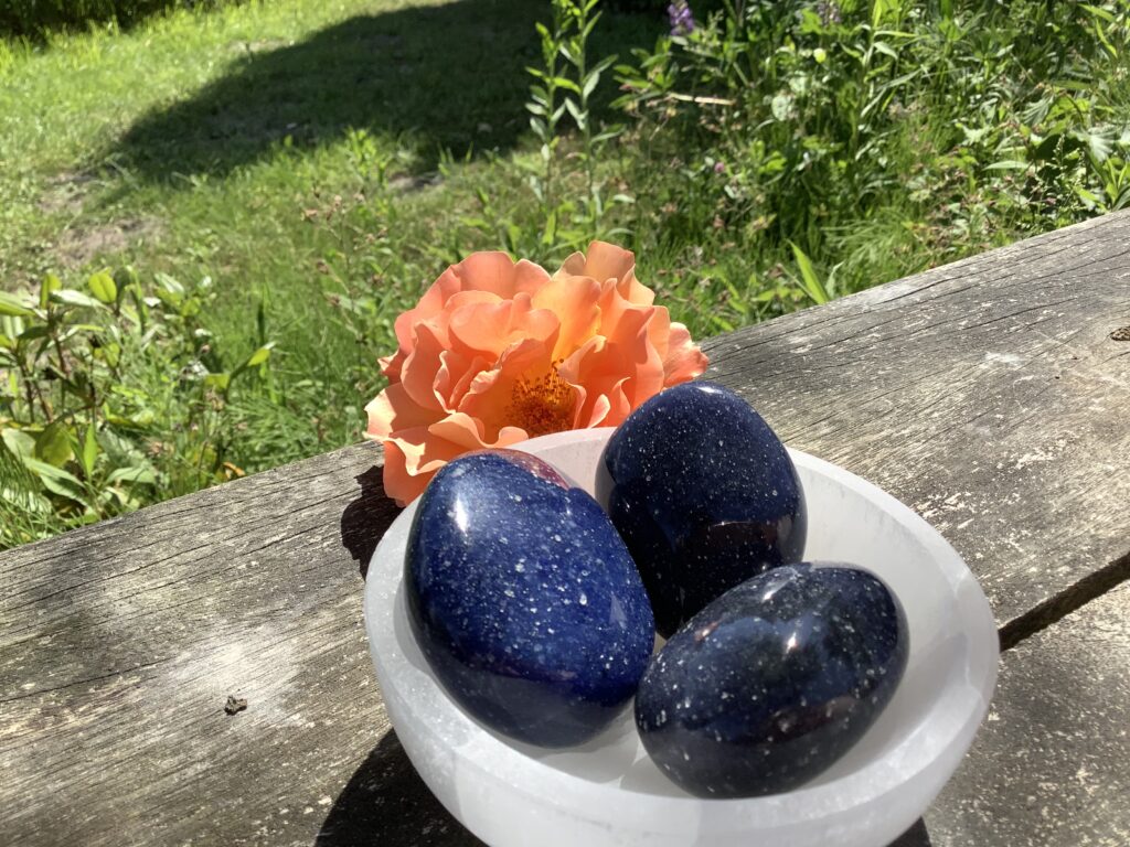 Een tijdje geleden kochten we een ‘nieuwe’ lichtblauwe steen uit Madagaskar, dit bleek een Lazuliet te zijn. Nu zagen we bij onze vriend een doosje met dezelfde steen, maar dan veel donkerder van kleur, de kleine lichte vlekjes in de steen zorgen ervoor dat de steen net op een sterrenhemel lijkt. Zo mooi om te zien. De ene persoon zal meer aangetrokken worden door het lichtblauw, terwijl de ander voor het diepe, bijna nachtblauw zal gaan. Heerlijk om beide nu te hebben.