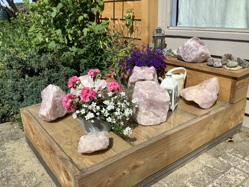 Zoveel stenen en kristallen inkopen is natuurlijk super, maar al het sjouwen minder. De grote Rozenkwartsen in zakken, de clusters, de dozen vol met Madagaskar stenen zijn voor een vrouw bijna niet te tillen, dus alles komt dan op de schouders van Wim neer. Gelukkig kan hij dit allemaal nog, maar we waren super blij dat bij thuiskomst een sterke zoon en schoonzoon gekomen waren om te helpen alles uit te laden. Zo lief! We hadden niet veel grote stukken Rozenkwarts meer over, alleen nog een klein aantal zeer zware exemplaren uit Namibië. Zo mooi om te zien hoe de energie in de tuin verandert na het neerleggen van al deze liefdevolle beauty’s. Het weekeinde zijn er al een aantal verkocht, omdat er klanten op slag verliefd op werden. Dit was ook het geval met een aantal grote Tibetaanse clusters, ze waren nog niet eens uit hun krat gehaald, omdat we daar nog geen tijd voor gehad hebben. Ook nu staan de meeste van deze nog in kratten in het pakhuis, omdat we nog geen plek hebben om ze neer te zetten haha.