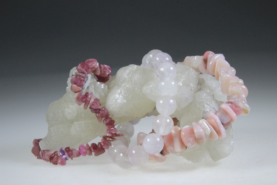We hebben te veel armbandjes om op te noemen, maar als laatste willen we toch even die van Toermalijn in het zonnetje zetten. We hebben prachtige, dieproze Rubelliet, maar ook een heel artistiek armbandje die wij Watermeloen Toermalijn noemen, omdat deze uit roze en groene Toermalijn bestaat. Ik vind het armbandje artistiek omdat het geen kraaltjes of steentjes zijn waaruit deze bestaat, maar mooie kleine ongelijke schijfjes, hij is grillig gevormd. Prachtig en onweerstaanbaar. Je kunt de uitgebreide beschrijving van roze en groene Toermalijn lezen als je meer informatie wilt weten. Toermalijn is een zeer liefdevolle steen die helende en beschermende eigenschappen bevat.
