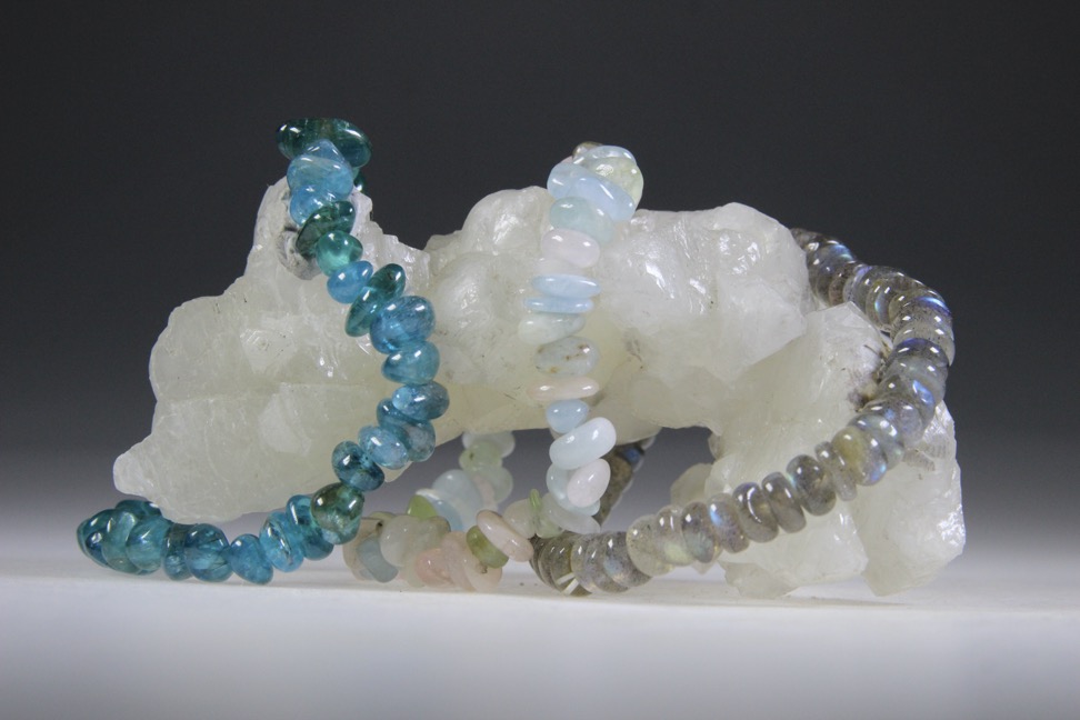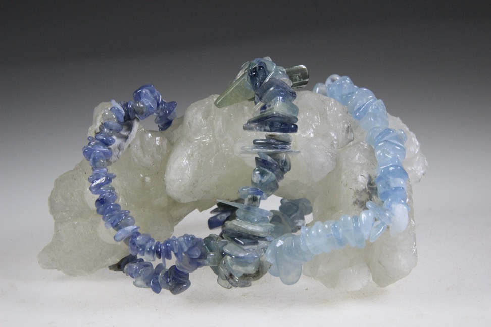 Van dezelfde mooie plattere kraal hadden ze ook Beril armbanden, en ook van mooie kleine ronde kraaltjes. Deze Beril armbanden bestaan uit kraaltjes van Aquamarijn en Morganiet. Beide behoren ze bij de Beril familie net als Smaragd, Heliodoor en Bixbiet. Het zijn stenen met een hoge vibratie en de combinatie van Aquamarijn en Morganiet verbind je keel met je hartchakra. We hebben ook armbanden met alleen diepblauwe Aquamarijn en mooi roze Morganiet ingekocht. Behalve in de winkel ook op de ‘webshop armbandjes’.