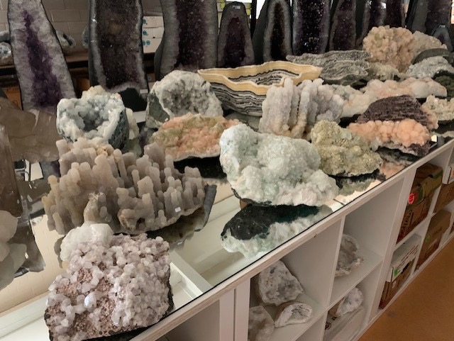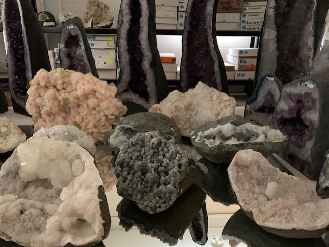 Omdat er waarschijnlijk de komende tijd geen inkoopbeurs zal plaatsvinden en wij weer wat ruimte in de winkel en het Pakhuis hebben zijn Wim en Nikki de opslag ingedoken. Nikki had vorige week een aantal dozen met Apofylliet open gemaakt. Zo heerlijk om weer verrast te worden wat we in januari allemaal voor moois hadden ingekocht. Ze heeft een aantal grote exemplaren van Apofylliet, veelal met Stilbiet, maar ook Engelen Chalcedoonkwarts uitgepakt en in het Pakhuis uitgestald. Kleinere en middelgrote exemplaren zijn in de winkel bijgevuld. Wij merken dat veel mensen zich meer bewust zijn van de trilling die kristallen in een ruimte uitstralen en dat ze steeds gevoeliger voor energie worden. We hebben de afgelopen weken van veel klanten gehoord hoe de energie verandert als ze een groter kristal voor hun huis hebben gekocht en omdat ze nu niet op vakantie gaan geld besteden aan een groter stuk, omdat ze daar zoveel plezier van hebben en hoe heerlijk hierdoor hun huis aanvoelt. Dit is zo fijn om te horen, zo fijn als klanten gelukkig van hun aankopen worden en dat onze kristalvriendjes ook voor hen veel betekenen. In deze tijd van veel thuis zijn is het dan helemaal fijn om te genieten van dingen waar je blij van wordt en die van je huis nog meer een thuis maken.