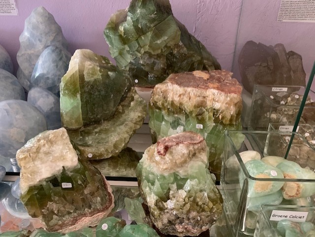 Van de week liep ik de winkel in waar Wim dingetjes aan het veranderen was, eigenlijk verbeteren ha ha. Hij heeft een mooi plankje bij de kassa gemaakt waarop de rollen met touw voor hangertjes nu heel mooi zichtbaar zijn uitgestald. De man is zo creatief. Nikki was bestellingen aan het doen. Ik zag toen meerdere hele grote Groene- en Regenboog- Calciet op tafel staan. Ik zei: wow wat zijn die mooi, ik begrijp niet dat deze nog niet verkocht zijn. Nikki en Wim lagen in een deuk, want deze bleken net uit dozen uit het magazijn gehaald te zijn. Ze weten hoe verstrooid ik soms ben, dat ik soms een verandering denk te zien die er al maanden is. Normaal vergeet ik stenen niet, maar nu dacht ik dat deze ergens in het Pakhuis boven op een kast hadden gestaan. Maar heerlijk dat we nog zulke mooie exemplaren hebben.