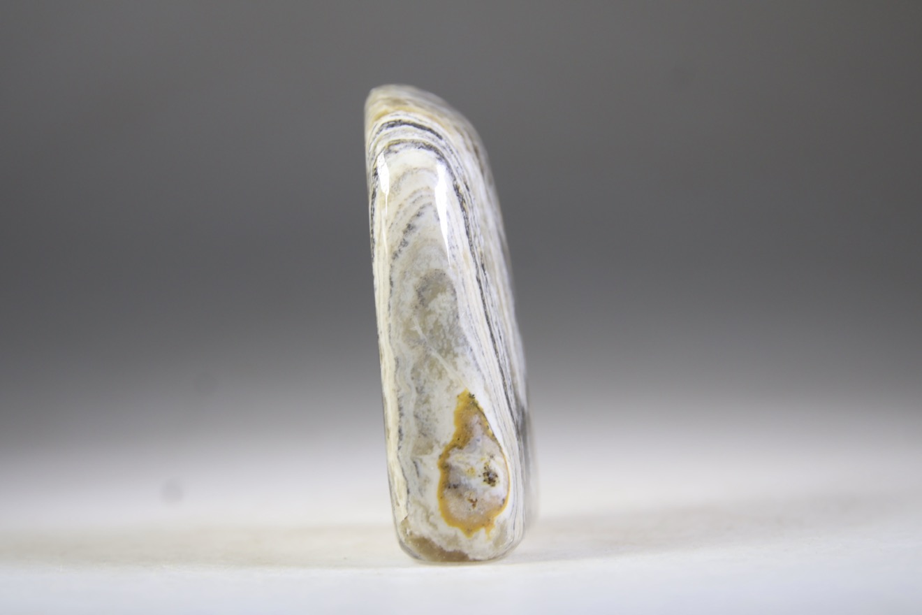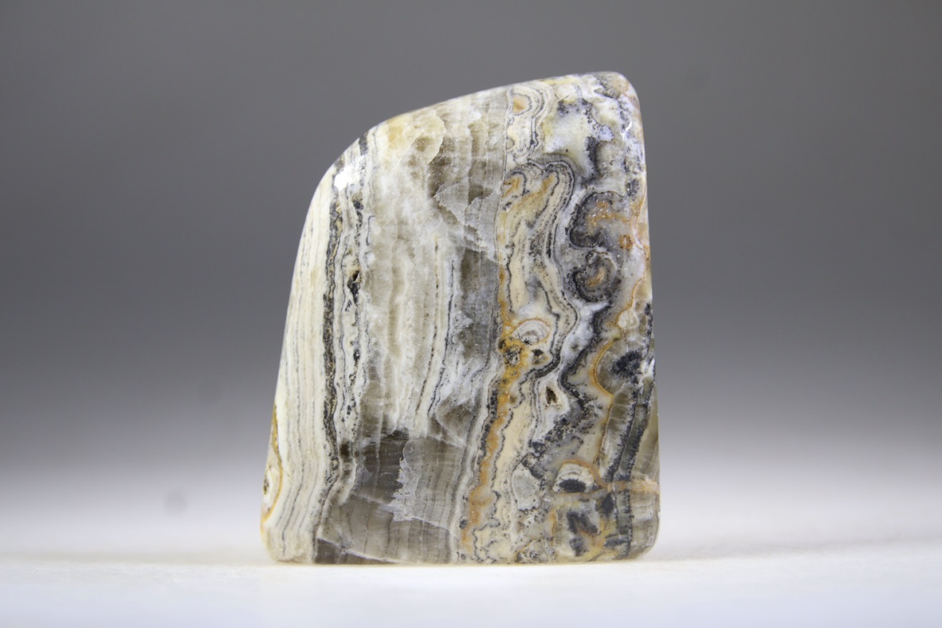 Eye of the Storm Calciet heeft mooie patronen in gouden zandtinten, afgewisseld met donkergrijze lijntjes. Deze steen staat voor grenzeloosheid, oordeelloosheid en alles omarmen, zowel het licht als het donker. De mooie gouden kleuren vertegenwoordigen het licht van de zon, de donkere lijntjes de schaduwkanten. Deze tijd van vrede en oorlog, heelheid en ziekte, stormen en prachtige zonnige dagen laten de dualiteit van de aarde zien. Dit brengt veel mensen uit evenwicht. Velen gaan op en neer, van angst en vrees naar hoop en vertrouwen. Deze steen helpt ons om te vertrouwen op wie we zijn, lichtwezens, om in overgave te gaan leven, hier niks meer van te vinden, uit deze dualiteit te gaan, te accepteren dat dit allemaal delen van het spel en van onszelf zijn. We hebben zoveel in hokjes geplaatst, dat is goed en dat is fout. Niet alleen over situaties buiten ons, maar ook over onszelf. Deze steen laat de woestijn voelen en de elementalen die zich daar bevinden, vooral het element wind. Deze wind heeft stof in de ogen geblazen, maar wind is ook als een frisse wind, die ons hoofd leeg kan blazen, die uitzuivert. Als je niet meer kadert, word je een waarnemer, waarna het zand uit je ogen zal gaan. We kunnen alles gaan zien, het grote geheel gaan waarnemen. Je stapt uit het beperkte zicht, het begrensde denken. Deze mooie Calciet bevat zowel hemel als aarde. De steen heeft krachtige aardende eigenschappen, maar heeft ook een hoge, liefdevolle vibratie, verbonden met de opkomende Zon, de Moeder Godin. Deze Calciet die rust en kalmte geeft zegt: “Master your emotions”. Ik draag een energie die je bij jezelf brengt. Dit is een perfecte steen om mee te mediteren, omdat deze je helpt om in verstilling te komen. Deze brengt je voorbij je angsten en geeft kracht en stabiliteit. Deze gelaagde steen draagt de geschiedenis van de aarde in zich, tijdperken, beschavingen die we als licht en andere als donker hebben ervaren. Deze unieke Calciet verbindt ons met het DNA van Moeder Aarde, haar oorspronkelijke energie die liefde is en helpt ons weer afgestemd te gaan leven met de ware natuur.