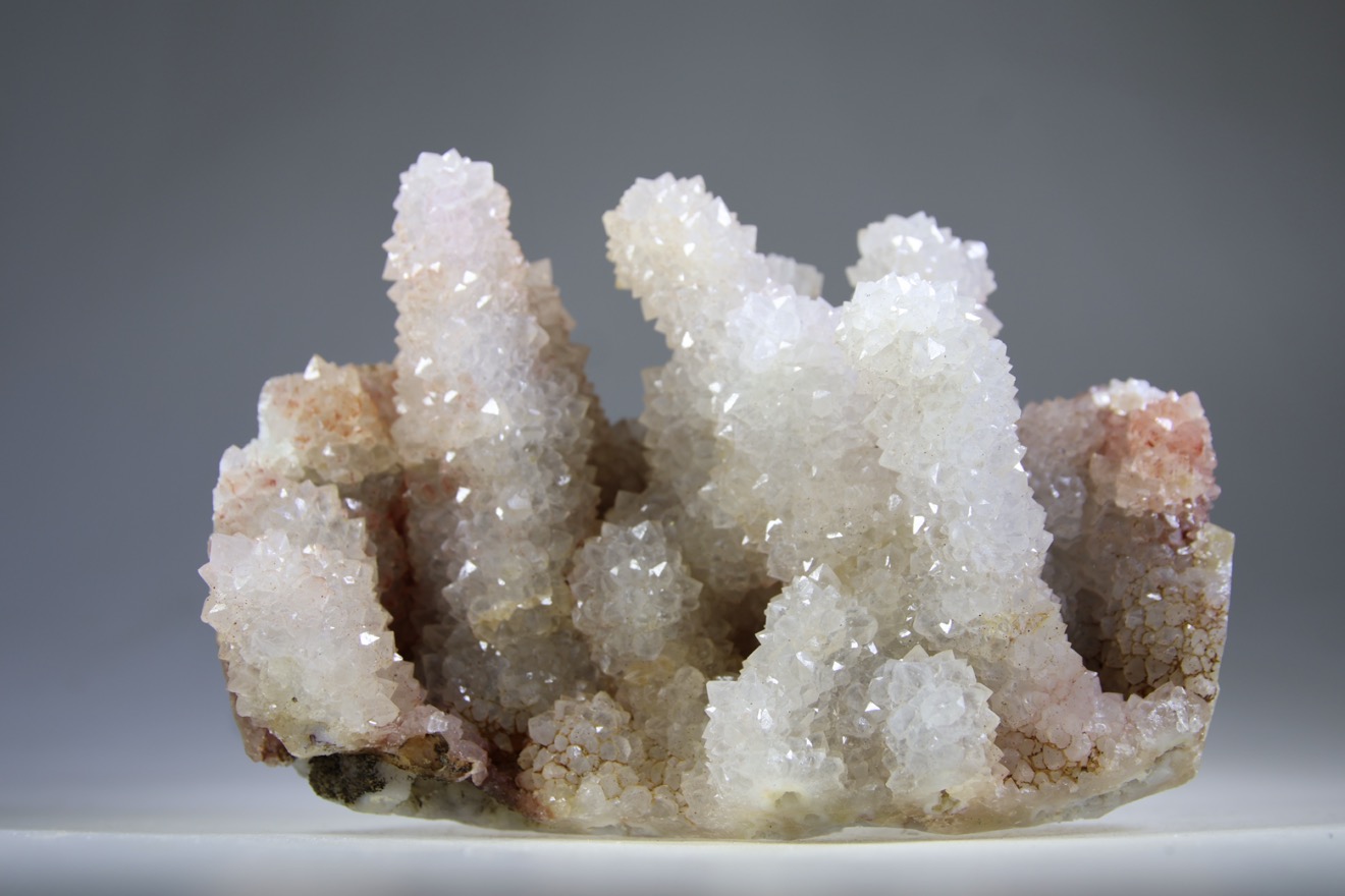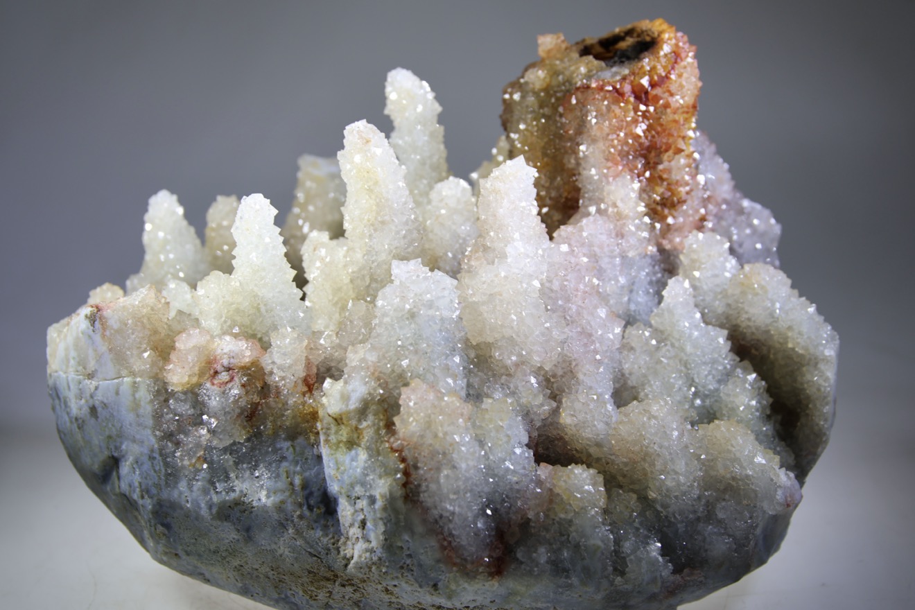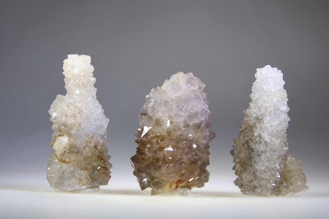Deze stalagmiet kristallen, clusters komen in verschillende samenstellingen voor. Sommige zijn Amethist, andere meer Rookkwarts, of meer Bergkristal met wat Golden healer erdoor. Veel zijn een mengsel hiervan. Er zijn ook clusters met minder uitgesproken stalagmiet vorm, deze zijn meer bloemvorm. Zoals ieder mens uniek is en zijn eigen pad volgt, zo spiegelen ook deze kristallen dit naar ons. Net zoals de Zielkwartsen uit Afrika zijn ook deze kristallen van onderaf aan opgebouwd. Anders dan ‘normale’ kwarts punten. Het woord cumulatief laat het kristal weten, dit betekent dat iets groeit of zich ontwikkelt door een opeenstapeling van elementen. Stapsgewijs, door een groeiproces is de steen opgebouwd. Dit geld ook voor ons mensen. Stap voor stap ontwikkelen wij ons individueel tot we verlichting bereiken. Maar zonder de spiegel van anderen zullen we niet groeien. We worden dus geboren in een zielengroep, ieder met zijn eigen ‘kleur’ om ons los en met elkaar te ontwikkelen. Als we afdalen van de bron gaan we op reis om ervaringen in de stof op te doen. We raken het gevoel kwijt dat we verbonden zijn, we ervaren de afgescheidenheid. Dit hoort bij de ervaring van de ziel. Uiteindelijk is het weer de weg terug naar de bron en dan kom je andere delen weer tegen, waar je resonantie mee voelt, waarna je weer terugkomt in eenheidsgevoel. Zoals de Maya’s zo mooi zeggen ‘In lak’ech’ ofwel; ‘Ik ben een andere Jij’. Deze stenen staan voor de vervolmaking van ons groeiproces. De clusters laten losse individuen zien die de laagjes van het geheel bevatten en een groep zijn. Ze staan symbool voor een bepaald punt van bewustzijn in onze evolutie waar we nu beland zijn. We zijn uniek, we zijn niet de ander, maar we komen wel uit dezelfde bron. De puntjes vertegenwoordigen de unieke ervaringen en groeiprocessen. Alle ervaringen bundelend geeft de unieke kleur. Daarom hebben deze zielenclusters ook allemaal een andere kleur, vorm, samenstelling en specialisatie. Ze staan symbool voor alle ervaringen gebundeld. Ieder met zijn eigen ervaringen, reisverhalen en deze uitstralend en uitdragend, die weer gaan thuiskomen. We staan op onszelf maar ook niet. Zo brengt iedereen zijn unieke kleur in het geheel in. De kristallen vergemakkelijken de samenwerking tussen leden van een groep. Het zijn kristallen van harmonie en uitlijning. De punten of bloemen versterken energie en reflecteren licht naar elkaar, zodat iedereen kan baden in de gecombineerde uitstraling van het geheel. De resonantie ervan is spiritueel verheffend, straalt hoog-vibrerende energie in alle richtingen uit en is een perfecte bondgenoot in het uitlijnen van de aura, chakra’s, meridianen en het fysieke lichaam, evenals het uitdragen van de informatie van de geest, hogere zelf naar de wereld.